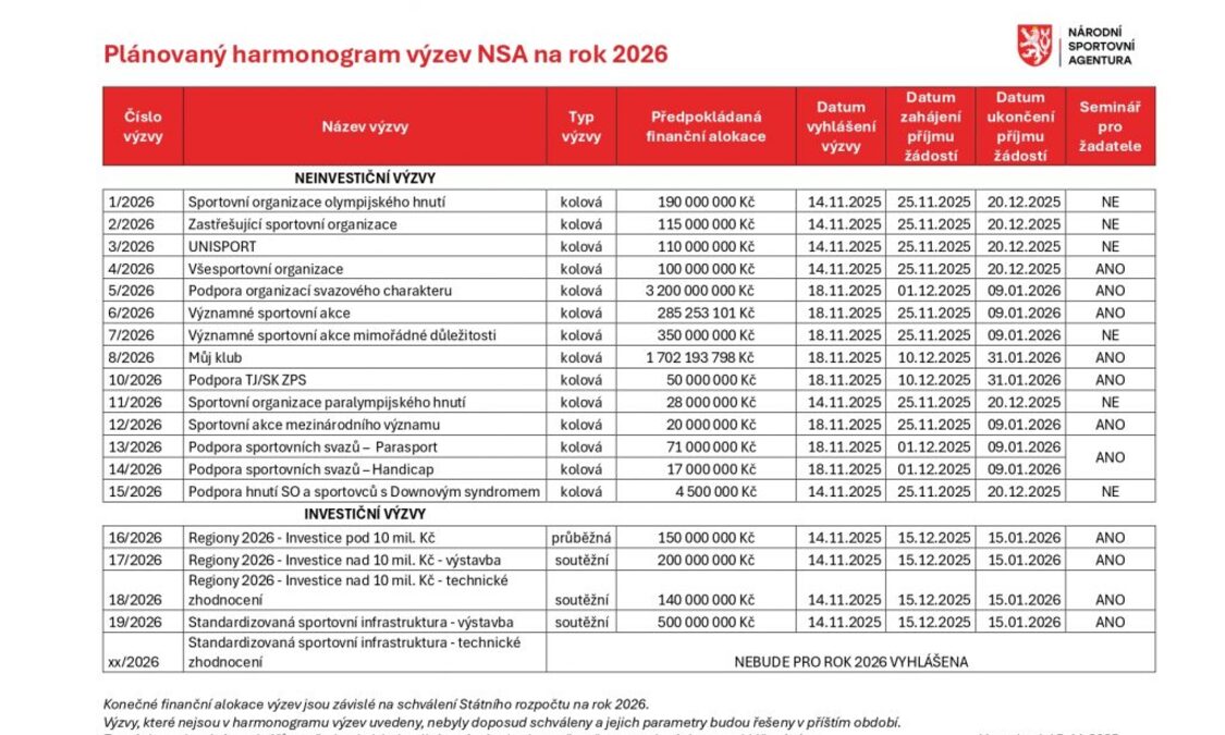 Plánovaný harmonogram výzev NSA 2026